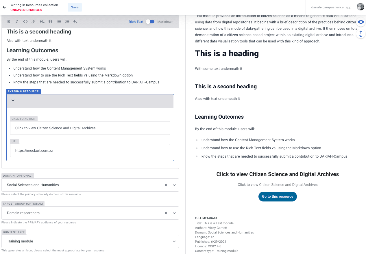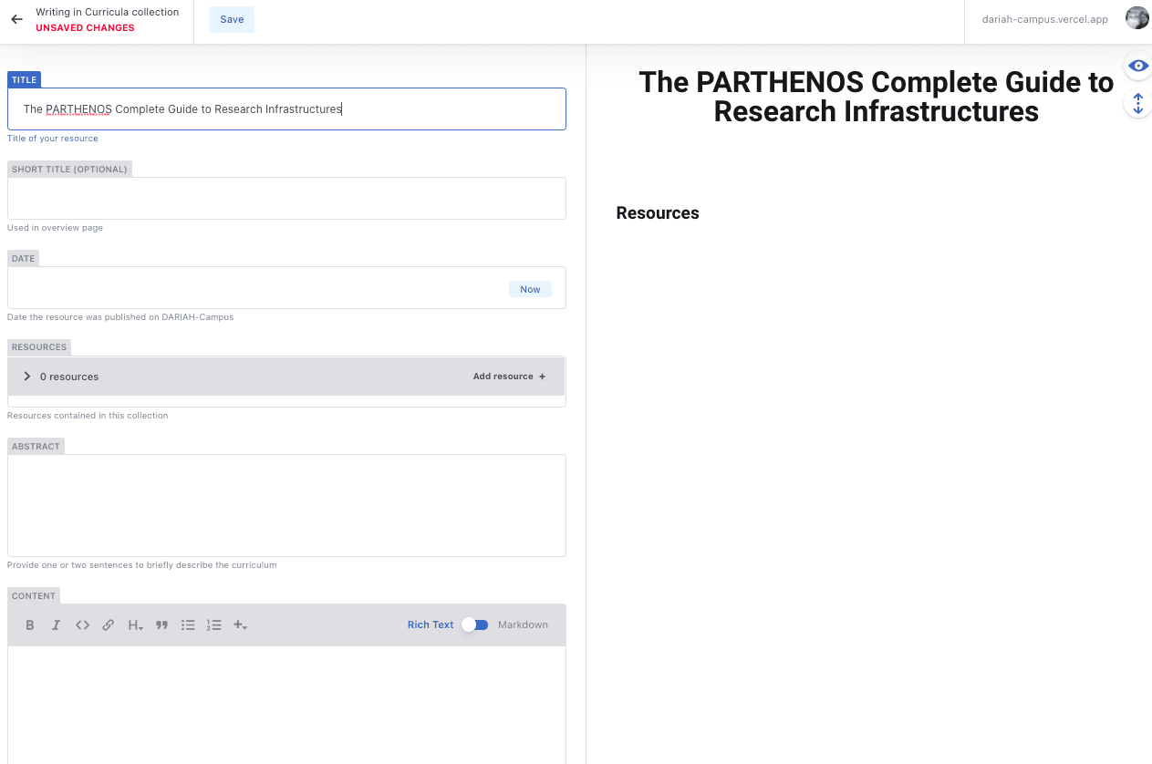 - This will bring you to a page with a form with two columns: a form on the left hand side, and a preview panel on the right. As you add items, you will see that the preview panel will start to display them so you can see how they will show up on the main DARIAH-Campus site.