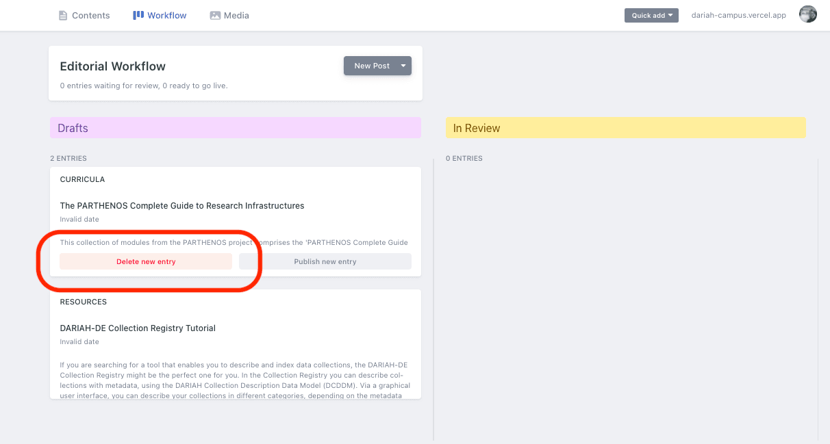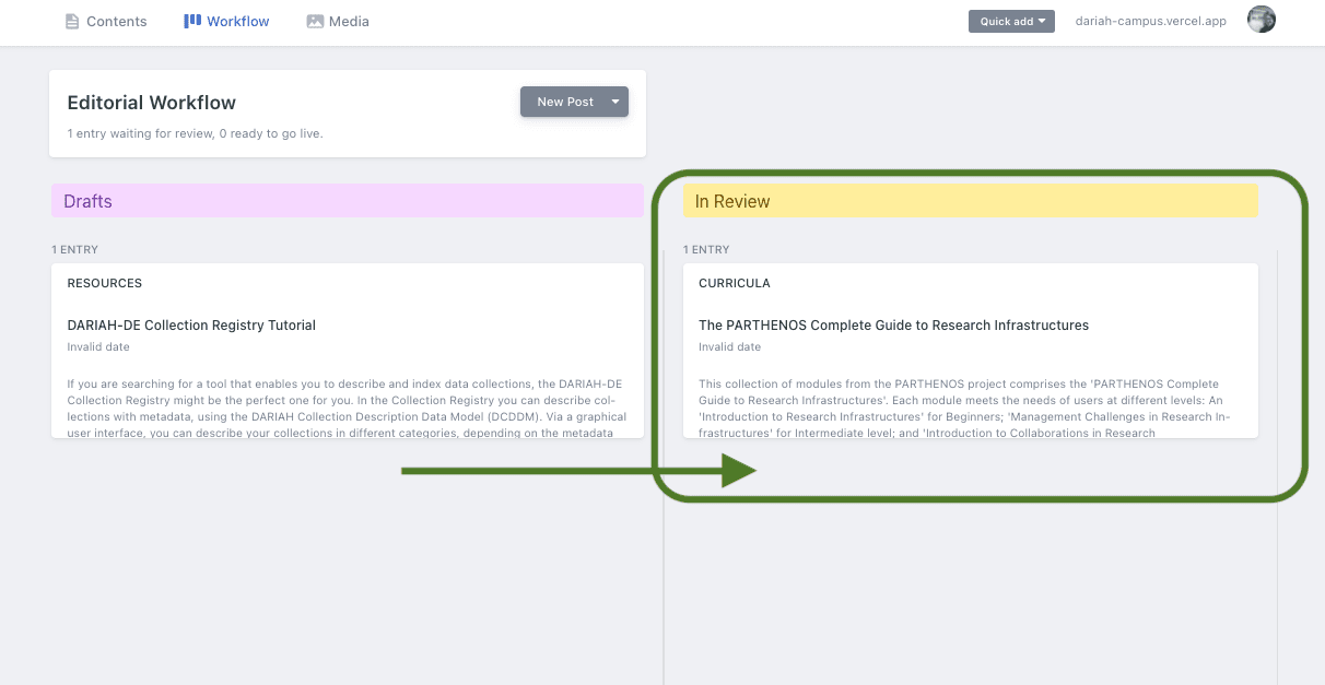 - After either step 2a or 2b, you can check in on your new resource (draft or in review) by clicking on the ‘Workflow’ menu option along the top bar. This will bring you through to the ‘Editorial Workflow’ space, where you can look at your current drafts, and also your items in review.