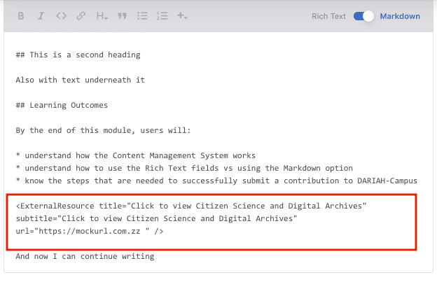 For example, if you want to get the in-house style for the ‘External Resource’, you can toggle to Rich Text editor, select ‘External Resource’ from the ’+’ menu and enter the required information (see 1), and then toggle back to the Markdown editor. The inserted code for this resource type is there (see 2), and you can continue typing your content as required.