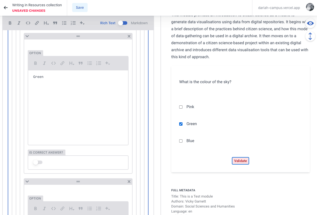 The ‘Quiz’ option allows you to create a quiz or self-assessment either at the end of a section or the end of the entire resource. The current options available are either to ask questions with multiple choice answers, or to create something using an XML code editor. If you are not confident in using code, we recommend that you try to format your questions to Multiple Choice to keep it simple.