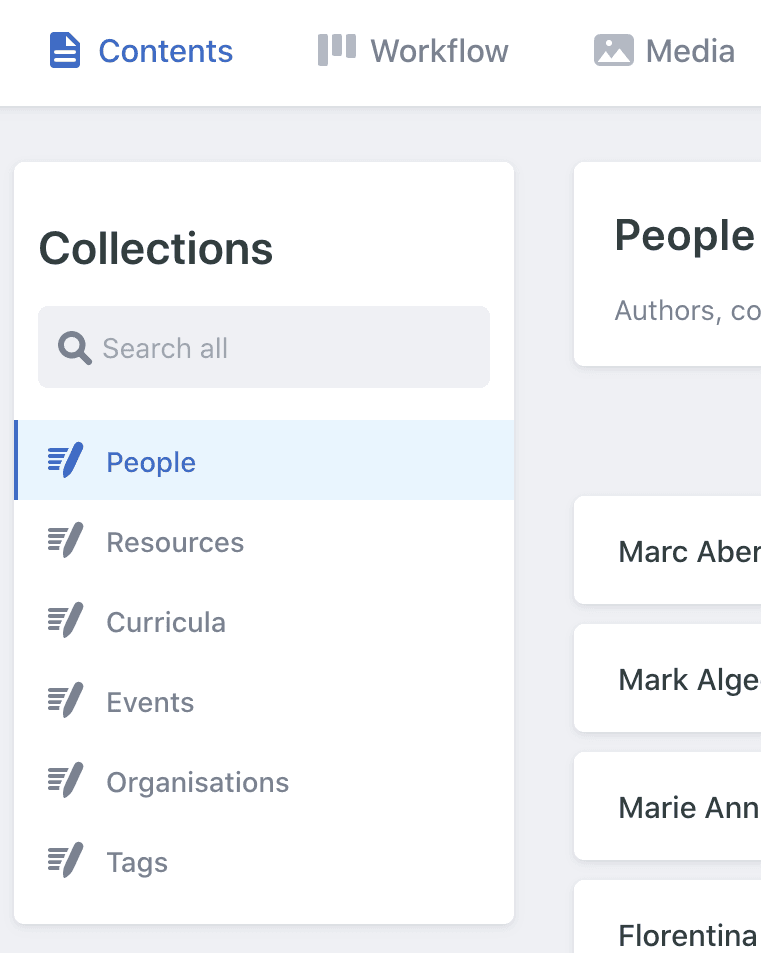 Along the top you will see three main menu items: ‘Contents’, ‘Workflow’ and ‘Media’.
