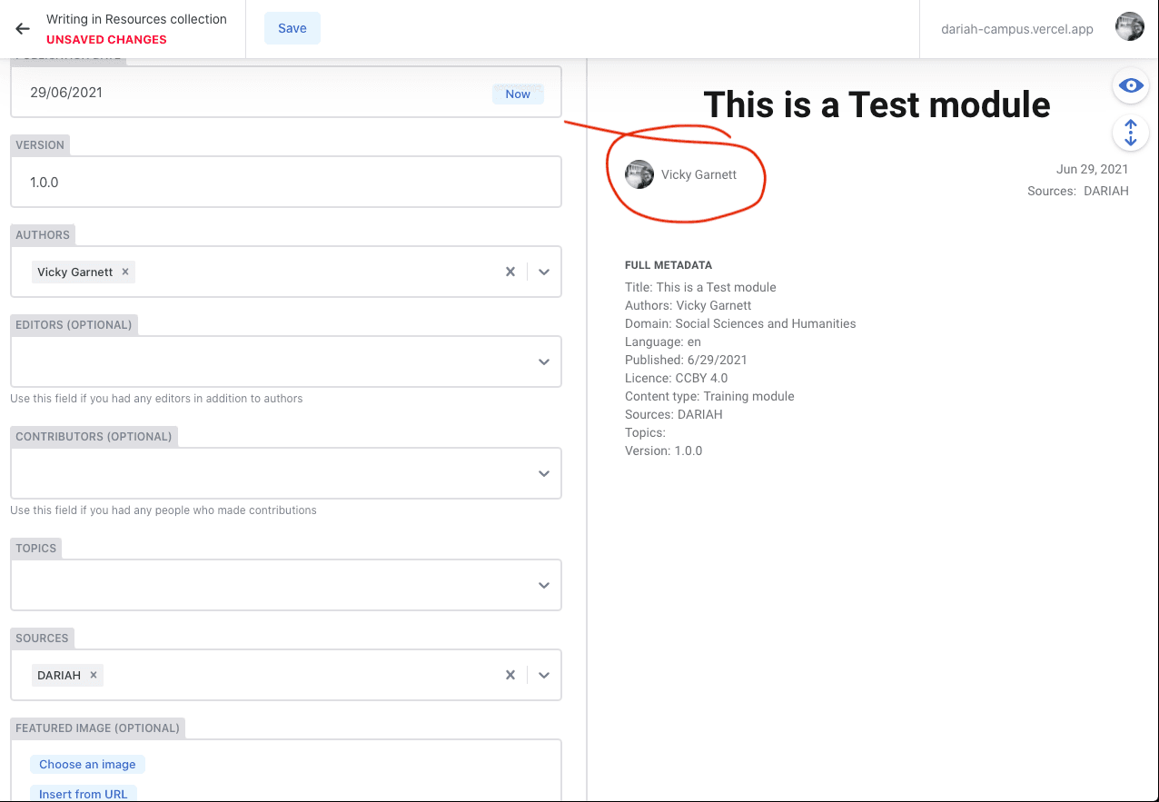2b) If you have other things to work on, or for any reason want to check back on another resource you have created, you can click on the arrow in the top left-hand corner. Make sure that the message next to the arrow says ‘CHANGES SAVED’. If you have left one of the required fields blank, this will tell you with an error and mark the required field border as red.