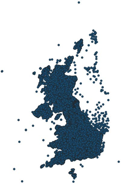 You should now be able to see all of the places from within the GeoNames file visualized within QGIS, covering all of Great Britain.