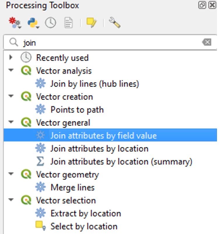 First, open the Processing Toolbox again (as we did in Step 3c) This time, type ‘join’ into the search box and locate Join attributes by field value (under the ‘Vector general’ heading). Double-click on this.