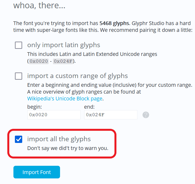 • Load the file KompLettR.ttf you find here into Glyphr Studio and make sure you choose to import all glyphs:
