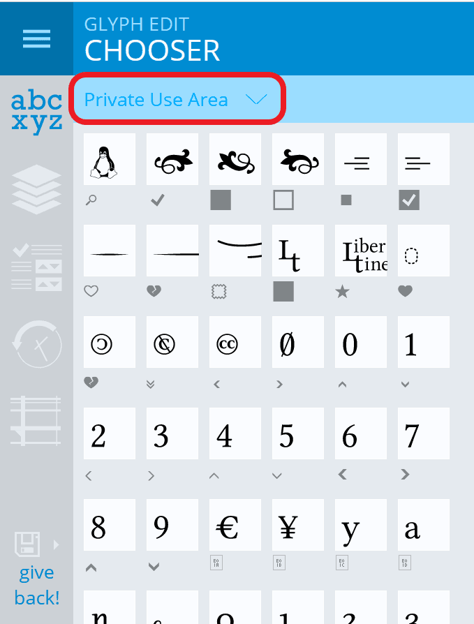 • After the file has been loaded, you can view the font characters it contains. The special characters defined in the allEntities file are located in the Private Use Area of the font. Therefore, select this area for display: